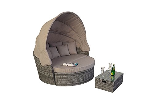 PRODUCT DESCRIPTIONS:The Rustic Large Daybed includes the bed itself with a retractable canopy and a glass topped coffee table. The bed is made from two modular pieces so can be configured either as a full bed with side table or separated to give two bench seats with a coffee table. When not in use the coffee table can be stored in the middle of the daybed. It also comes with base and matching scatter cushions. The Rustic range is constructed with a mixed brushed grey poly rattan weave and alloy framework. It is also finished with natural beige cushions and adjustable levelling feet. The frame features our latest v2.0 zinc powder coat rustproof coating for extra weatherproof durability.