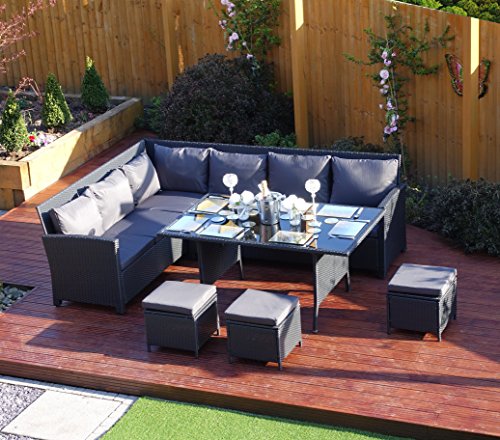 Buy 9 Seater Rattan Corner Garden Sofa & Dining Set Furniture 2016 Black Brown Dark MixedGrey (Black with Dark Cushions) Online