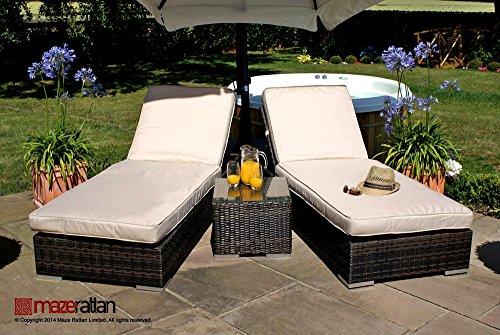 PRODUCT DESCRIPTIONS:The Orlando Sun Loungers are ideal for 2 people to sit back and relax by the swimming pool on a warm summers day. We also included a set of sun lounger cushions which have been made from polyester which is in fact a water resistant material that is designed for outside use. Included within the set is a convenient Orlando Table which has been constructed from a mixture of resin weaved wicker and glossed glass. The table surface has been manufactured from a piece of glossed glass which is we believe makes the table look aesthetic and contemporary. Recommendations 1. A 100% waterproof cover will protect your sofa all year round 2. Cushion Storage Bags and Boxes to keep your cushions clean 3. Golden Care Products to keep the rattan clean and looking brand new 4. Cantilever Parasols overhanging parasol that will keep the sun out your relaxing area.