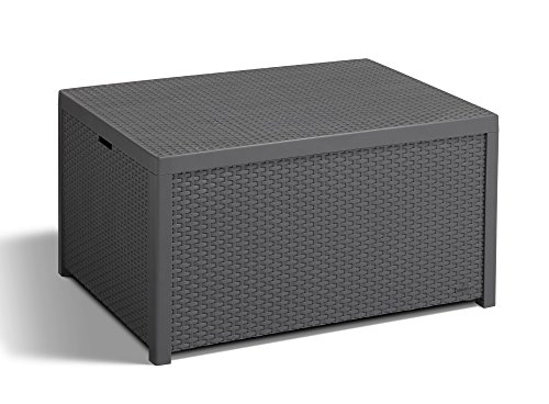 PRODUCT DESCRIPTIONS:Our Allibert Arica Poly Rattan Graphite Grey Cushion Storage Table is constructed from stylish, woven rattan-style resin and is perfect for the garden, patio or conservatory. This durable, robust table has a spacious storage space for cushions or to tidy away clutter and is colourfast, UV and weather resistant. A perfect complement to the Allibert graphite range of outdoor and conservatory furniture. Features: Handy cushion storage box and spacious table. Ergonomic inset handle grabs for easy opening. A perfect complement to the Allibert graphite outdoor furniture range. Easy to clean and maintenance free. Simple snap together construction, so no need for tools. 3 Year guarantee, Will not rust, unravel or fray. Also available in brown Grey. Made in Europe.