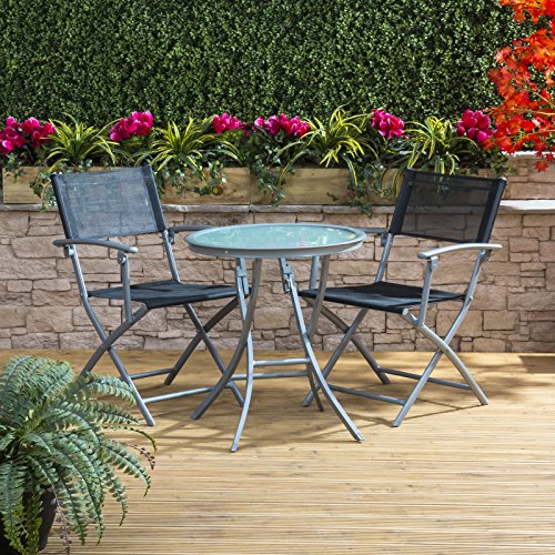 PRODUCT DESCRIPTIONS:• Enjoy brunch or afternoon tea on your balcony or patio with this fantastic bistro set. You will have enough room for two people to dine and relax in maximum comfort. Different chair materials mean you can pick the perfect design to match you outdoor living space. • For comfort the seat and back is made from a premium textoline material which also adds maximum durability for years of use. • When you don't need the table and chairs or want to create a little more space each piece folds down quickly and easily so it can be stored away. Being made from aluminium also makes this bistro set incredibly lightweight so you can move it around with ease. • Safety has been considered even right down to the table top, this is made from premium safety glass with a frosted finish. • Set includes: 1 x Table, 2 x Chairs • Dimensions: Chair: Height 83cm, Width 56cm, Depth 57cm • Dimensions: Table: Diameter 60cm, Height 66cm • Assembly required • We recommend covering this bistro set when not in use.