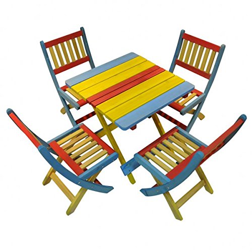 PRODUCT DESCRIPTIONS:This 5 piece table and chairs set is a vibrantly coloured furniture set that will brighten up any garden or patio space. Designed to give the kids a place to sit and enjoy the summer weather, it is also ideal for small children to be used for eating at as well as other activities such as art and crafts, drawing or painting or simply enjoying a bite to eat. The wooden multi-coloured table and chair set has been designed in a multitude of bright colours which is both fun and attractive. It will make an eye catching feature in any garden.