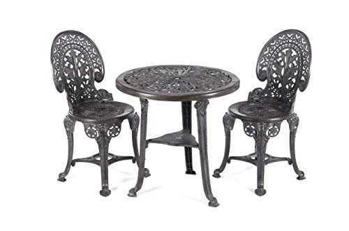 PRODUCT DESCRIPTIONS:A stylish 3-pc 'Wenlock' bistro set in finished in a stunning gun metal finish. Made from polyurethane its strong contraction allows it to provide years of maintenance free functionality. The set includes two chairs and a round table.