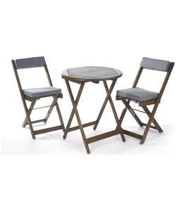 PRODUCT DESCRIPTIONS:This High quality Bistro set with removable colour coordinated cushions will allow to relax in your garden while catching up with friends. Comes with a 12 month guarantee. Garden table features: Acacia wood table top. Wood garden table. Table size: H72, . Table diameter: 60cm. Garden chair features: Seat height 46cm. Wood folding chairs . Size H78, W38, D34cm. Cushion features: Grey cushions. Removable and washable covers.