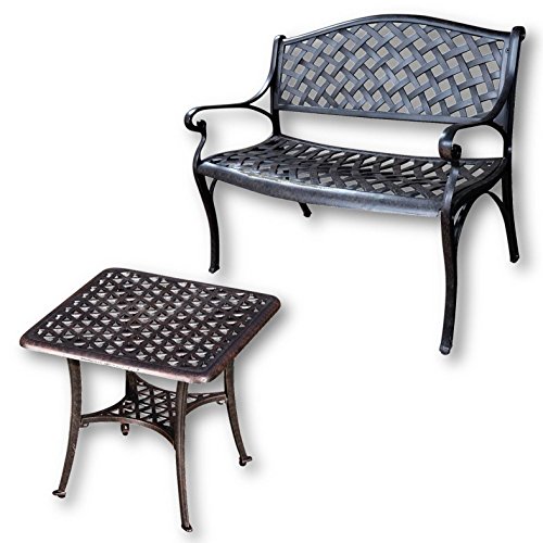 Dimensions of the Jasmine bench: - Length: 103 cm - Width: 60 cm - Height: 85 cm - Weight: 14 kgThe Sandra coffee table is a square low side table, also made from cast aluminium, and great to share a drink in that sunny corner of your garden.