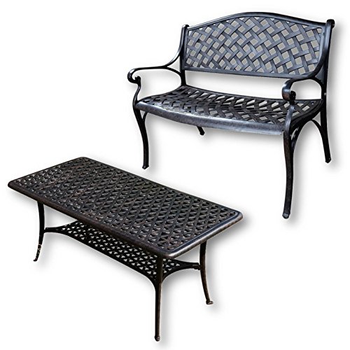 Dimensions of the Jasmine bench: - Length: 103 cm - Width: 60 cm - Height: 85 cm - Weight: 14 kgThe Claire coffee table is also made from cast aluminium, and is one of our most useful pieces of garden furniture due to its versatility. It can be used as a side table for drinks, or used as a two person table for that sunny corner in your garden.