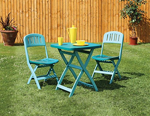 PRODUCT DESCRIPTIONS:The Bistro set has plenty of style and quality. It is made from premium plastics ensuring that it is weatherproof and maintenance free. The chairs and table Fold flat making it easy to store and carry when not in use. It wouldn’t look out of place indoors as well as out.