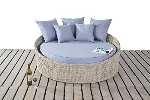 PRODUCT DESCRIPTIONS:You can see our full range of Rattan Garden Furniture at the best prices on out website www.cheapgardenchairs.com The Rural Rattan Garden Furniture Small Daybed includes a circular bed with a thick base cushion and matching scatter cushions for added comfort. The Rural range is constructed using half round natural tone poly rattan weave with feature highlights and alloy framework. It is also finished with luxury heavy weight grey cushions and adjustable leveling feet. The frame features our latest v2.0 zinc powdercoat rustproof coating for extra weatherproof durability. Â