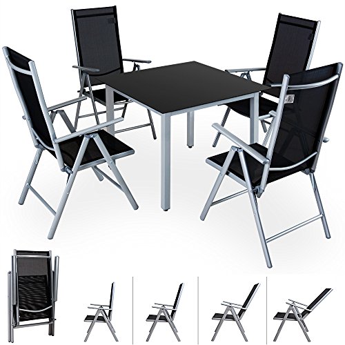 PRODUCT DESCRIPTIONS:Exclusive, 5pcs. aluminium garden table and chairs set with table plate made of high-strength safety glass, foldable and 7 positions adjustable high backrest.