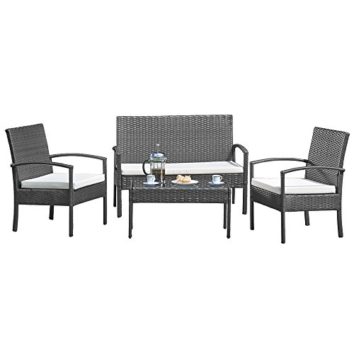 PRODUCT DESCRIPTIONS:Relax in style this summer with this high-quality rattan furniture set. You can soak up the sunshine in complete comfort with this outstanding focal point for your patio, decking or lawn. The set consists of an elegant two-seater sofa and two armchairs, both featuring attractive contrasting cushions, as well as a table with a glass top that adds the perfect finishing touch. Made from weatherproof rattan-effect polyethylene (PE) for added durability. Chairs measure H78 x W57 x D54cm. Table measures H38 x W40 x L75cm. Sofa measures H78 x W108 x D54cm. Maximum load single chair: 120kg. Maximum load sofa: 180kg. Some easy self-assembly required.