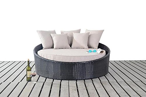 PRODUCT DESCRIPTIONS:You can see our full range of Rattan Garden Furniture at the best prices on out website www.cheapgardenchairs.com The Luxe Rattan Garden Furniture Small Daybed includes a circular bed with a thick base cushion and matching scatter cushions for added comfort. The Luxe range is constructed with a smooth mixed dark brown poly rattan weave and alloy framework. It is also finished with natural beige cushions and adjustable leveling feet. The frame features our latest v2.0 zinc powdercoat rustproof coating for extra weatherproof durability.
