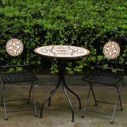 PRODUCT DESCRIPTIONS:These unique and authentic mosaic bistro sets have been constructed with a black powder coated steel frame. The table tops and chair panels have been designed with attractive broken tiles inlaid into them creating this lovely mosaic effect in 4 different styles and colours