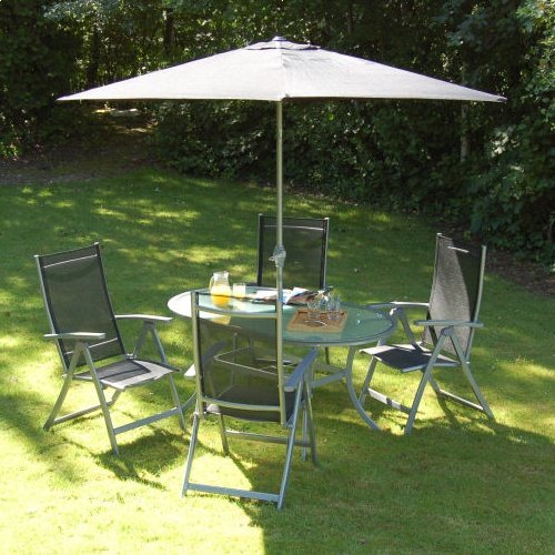 PRODUCT DESCRIPTIONS:• This contemporary oval garden patio set is a fantastic modern addition to any patio, decking or terrace area so you and your family can enjoy meals in the summer sun in absolute comfort. • Each chair and table frame is made from powder coated steel frame which provides stability and durability, which is perfect for sitting round the table dining all summer long. • Premium glass top provides the perfect surface to dine and allows for maximum sturdiness and strength to cope with family meals. • For the ultimate in low maintenance design each chair seat and back is made from a premium textoline material that is a synthetic fabric and developed to be strong and comfortable as well as being UV and weather resistant. • Be in absolute comfort when you're sat down with the multiple reclining positions that are possible from each armchair. • When not in use the chairs can be folded down for storage in a garage or garden shed. • Dimensions: Table: Length 152cm, Width 96cm, Height 72cm • Dimensions: Chairs: Width 58cm, Depth 72cm, Height 107cm • FREE 2.7m Parasol