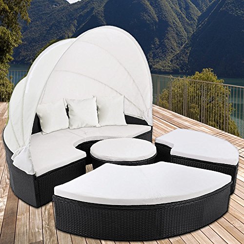 PRODUCT DESCRIPTIONS:Exclusive Poly rattan garden bed - Luxury in your garden Poly rattan is a very stable, uniformly wound plastic fiber that has been especially developed for garden furniture. It is easy to clean and dirt-resistant. Removable seat covers The covers of the 7centimeters thick seats are water repellent. The removable covers also have an hidden zipper. Structure/frame The poly rattan is woven up to an extra reinforced metal frame. The adjustable screw feet allow you to have a stable stand, even on uneven surfaces. Canopy The foldable canopy with gas pressure cylinders offers a pleasant shade and protection from the wind. The seaprable lying surface can also be transformed in an instant to a table with its comfortable seatings. The parts of the garden bed can be interconnected with connecting hooks. Versatile Suitable for both indoor and outdoor use, used as a comfortable bed or sofa. The garden bed is delivered in individual segments. The corresponding assembly material is included. Total dimensions: - 185 x 185 - Height without foldable canopy: 75 centimeters Seats: - Thickness: 7 centimeters - 100 percent Polyester Cushions: - 100percent Polyester Material: - Structure: Polyethylene - plastic fiber Color: - Structure: Black - Cushions and seats: Cream Scope of delivery: - 1x Garden bed - 3x Cushions - 5x Seats - 1x Canopy - Assembly material and instructions - Delivery in 4 packages
