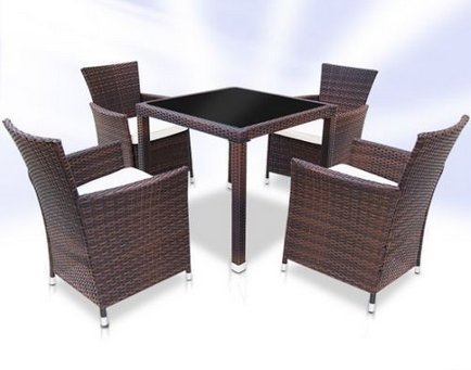 PRODUCT DESCRIPTIONS:Dining table and 4 chairs set Rattan garden furniture Set priced to clear immediately at a crazy price Premium Quality, PE all weather Rattan, UV treated and fade resistant Beige Cushions are included Cushion covers are removable for washing Weatherproof/showerproof Leave outside all year around Shower proof cushions No maintenance required black tempered safety glass Please note - table is always a very dark brown colour, almost black colour. Assembly is required Approximate Dimensions: Table - L 80cm x W 80cm x H 75cm Chairs - 47cm x 46cm x 46cm (depth, width, height)