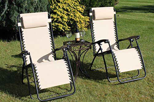 PRODUCT DESCRIPTIONS:A set of 2 luxury anti gravity garden chairs, fold up for easy storage. Come fully assembled, no construction required. Complete with metal side table worth £25.99. Table comes flat packed and is easily assembled in 5 minutes. Wine not included! These TOP QUALITY chairs are sturdy and strong, with a lock on the arms to hold in position if required. Weatherproof Textoline is in a beige colour. Detachable and adjustable head rest. Powder coated steel and textoline construction means this sun lounger can be left out for the summer, although we would recommend bringing inside for the winter. Adjusts from upright to relaxed back position with an infinite number of positions inbetween. Chair Size: 65cm Width x 152cm Depth x 114cm Height. The weight of the chair is 8.5kg. PLEASE NOTE OUR DELIVERY CHARGE IS FOR MAINLAND ENGLAND, WALES AND SOUTHERN SCOTLAND. FOR THE HIGHLANDS AND OFF SHORE DESTINATIONS PLEASE CONTACT US FOR A QUOTE, THANK YOU.