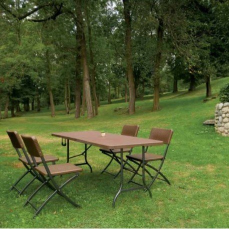 Set of folding tables and 4 sillass Ideal for the garden, the home and camping. The table is folding type suitcase and open measures 180 cm long. Injected Resin Finish That Simulates the woven rattan and gives a finish that is best suited to domestic environment that the traditional folding mesass.