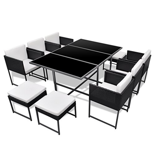 PRODUCT DESCRIPTIONS:This 10 person rattan dining set has an elegant design and consists of a table, 6 chairs and 4 stools, 10 removable seat cushions and 6 back cushions. It will be a great choice for al fresco dining or lounging. Specifications: Colour: Black Cushion colour: Pure white Material: Powder-coated steel frame + tempered glass table top Cushion material: 100% polyester Cushion thickness: 5 cm Chair size: 52 x 52 x 67 cm (W x D x H) Stool size: 44 x 44 x 38 cm (W x D x H) Table size: 165 x 109 x 72 cm (L x W x H) Delivery includes: 1 x Table with glass top 6 x Chair 4 x Stool 10 x Seat cushion 6 x Back cushion Easy to assemble Fabric: Polyethylene: 100%