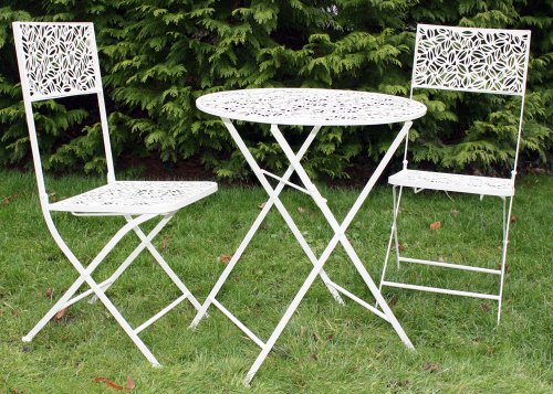 PRODUCT DESCRIPTIONS:An antique cream wrought iron table and 2 chairs bistro set. All parts of the set fold for easy storage when not in use making this the perfect set where storage space is a problem. The set is supplied fully assembled, all you need do is take it out of the box and unfold the table and 2 chairs. Made with an attractive leaf style cut out design this set is the perfect addition to your patio, deck, balcony or garden. The table is approximately 28.25" high x 24" diameter (38" high x 24" wide x 3" deep when folded). Each chair is approximately 36" high x 15" wide x 18" deep (40.5" high x 15" wide x 7" deep when folded).