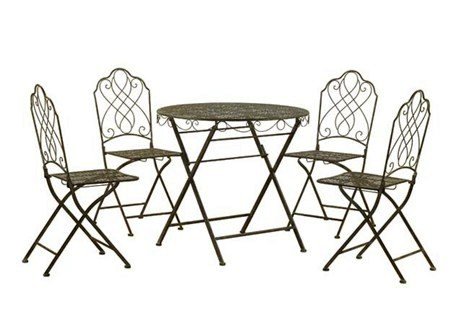 PRODUCT DESCRIPTIONS:Sturdy and lightweight with an ornate weathered look. Table and four chairs. Folds for easy storage. Ideal for any patio. Table: H 73cm x D 80cm.Chair: H 91cm x W 38cm x D 46cm