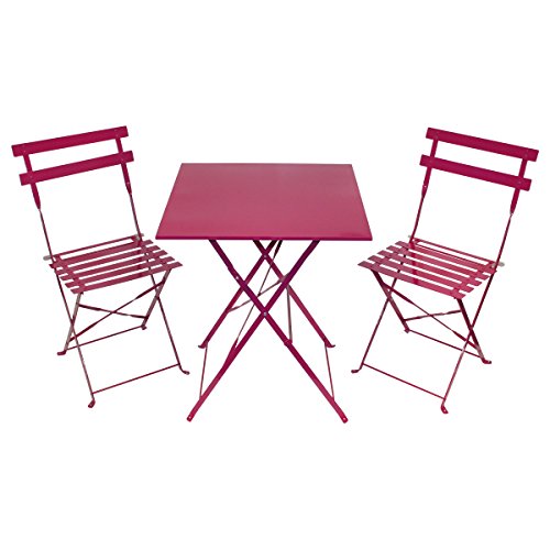PRODUCT DESCRIPTIONS:This 3 piece bistro set is ideal for small gardens, patios, balconies or conservatories. The table and chairs are foldable for easy, compact storage. The furniture has a powder coated finish and is rust and weather resistant. This set is classic and stylish and would suit any garden.