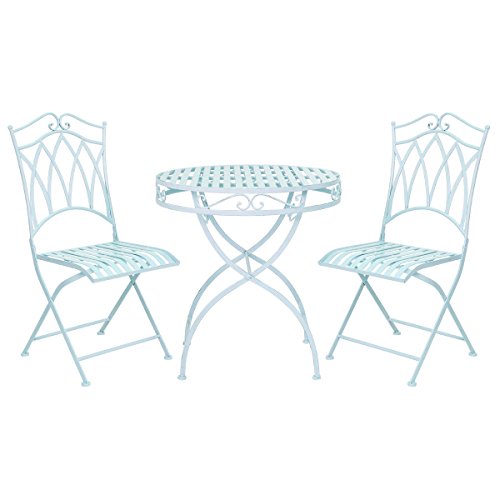 PRODUCT DESCRIPTIONS:This stylish bistro set will suit perfectly in your garden, patio or deck, adding a touch of distinction to your outdoor area. This set is finished in a lovely pastel shade and the curved design on the chairs and table is so elegant that you'll have every guest asking you about them. For your comfort the chairs are fully foldable, so they don't take up much space when not needed. The antirust finish on this garden bistro set guarantees a long lifespan, helping it withstand all outdoor weather conditions.