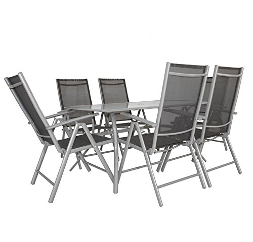 PRODUCT DESCRIPTIONS:This stylish 7 piece garden dining set includes a rectangular table and 6 foldable chairs. The table and chairs are finished in a silvery grey and the table has a white glass top. The chairs can be folded away which is convenient for storage and the table features a handy parasol hole. The chairs have 7 adjustable reclining positions for added comfort. This garden furniture set is ideal for the sitting on the patio or in the garden with friends and family in the summer months.