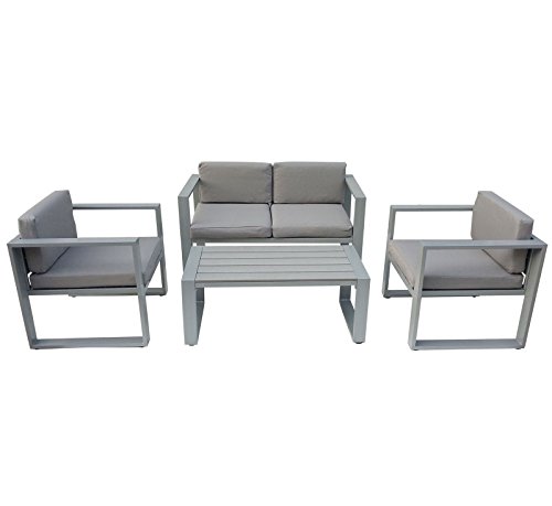 PRODUCT DESCRIPTIONS:This comfortable garden lounge set consists of one double sofa, two armchairs and one rectangular table. The set can also double as an outdoor dining set and it will look great on your patio, deck or conservatory as well. Cosy 10cm-thick cushions are provided to go with the sofa and armchairs. The lounge set can be safely kept outdoors all year round as the materials used on its production are weatherproof. For your tranquillity the cushions on the sofa and chairs meet the UK fire safety regulations.