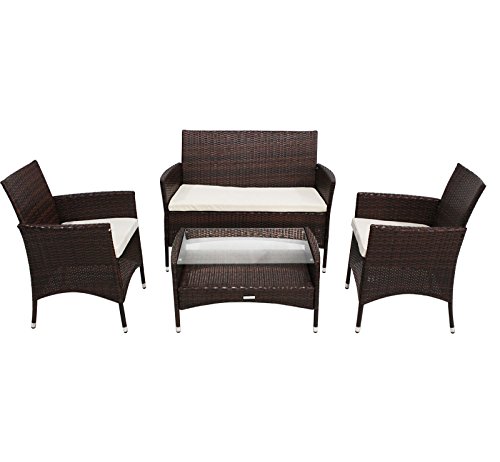 PRODUCT DESCRIPTIONS:This dark brown contemporary rattan furniture set consists of one double sofa, two large chairs and one glass coffee table. This rattan set is ideal for any size garden, patio, decking or conservatory and can be kept outside all year round due to its showerproof finish. Comfortable cream seat cushions are included and the coffee table features a lower tray to keep your things at hand. Matching furniture available in dark brown rattan: duo companion seat, 3 piece bistro set and 5 piece dining set.