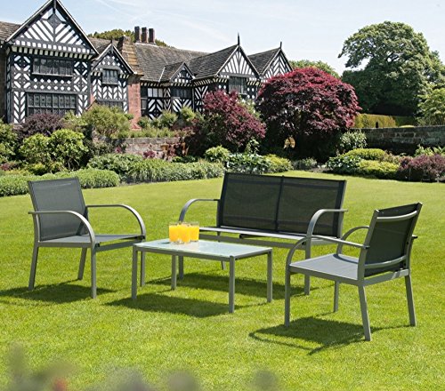 PRODUCT DESCRIPTIONS:Our Malvern 4 Piece Garden and Conservatory Set combines design-elegance and versatility with durability. Perfect for informal entertaining in the garden on the patio or in the conservatory. A pair of sturdily constructed grey powder-coated steel framed arm chairs and a two-seat sofa with strong woven Textilene panels, complement the matching coffee table. The sofa and chairs have a clean simple-lined design and the coffee table has a grey tempered glass top.