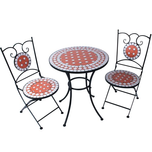 PRODUCT DESCRIPTIONS:The mosaic garden table set from Jago will give a Mediterranean atmosphere to your garden. Relax and enjoy the summer. Description: Mosaic garden table made of black powder coated steel Folding chairs made of black powder coated steel and ceramic mosaics Beautiful and classical design Solid Easy to assemble Folding chairs, easy to store Double strutting makes the mosaic table extremely stable TECHNICAL INFORMATION: Table, L/W/H: approx. 64/64/70 cm (25.2/25.2/27.6 in) Table plate, diameter: approx. 60 cm (23.6 in) Chairs, L/W/H: approx. 33/44/85.8 cm (13/17.3/33.8 in) Colour: Red, white CONTENTS INCLUDED: 1x Mosaic garden table 2x Mosaic - folding chair (some assembly required) 1 x Multilingual instructions