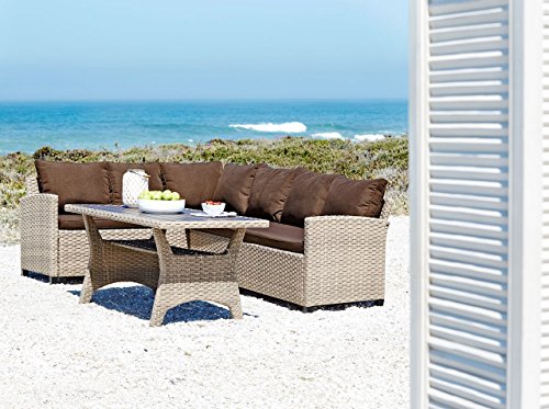 Luxury set that combines the advantages of a lounge set and a dining set. The set is made from steel and hand-woven, weatherproof petan. Table W75 x L145 x H68 cm with a durable, maintenance-free artwood top and matching corner sofa. Incl. luxury cushions with durable, structure-woven polyester covers.