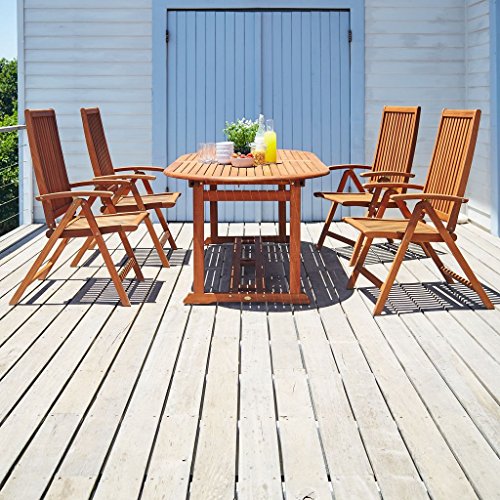 Set in oiled hardwood with wide, sturdy extending table W102 x L190/230 x H75 cm and matching 7-position recliners. Chairs fold for easy storage. FSC-certified wood. Table Chair