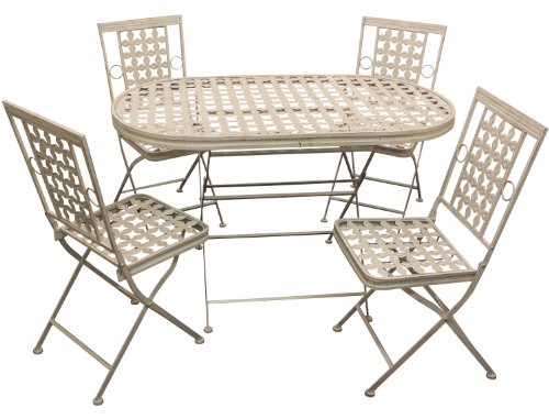PRODUCT DESCRIPTIONS:The Woodside® High Quality Cream Oval Folding Garden Patio Dining Set is perfect for outdoor dining. The set folds out in seconds, you will not have to mess around trying to set it up. Very strong and sturdy. This has a lovely design with a rustic finish and would look great in any garden. Colour: Cream, Material: Metal, Dimensions:Table - L: 122 (48") x W: 69 (27") x H: 76cm (30"). Overall chair height: 90cm (35"). Seat height: 45cm (18"). Width: 40cm (16"). Depth: 37cm (14.5"), Weight: Table: 12kg. Chairs: 5.5kg each.