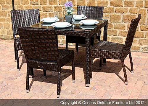 PRODUCT DESCRIPTIONS:The Marbella 90 outdoor dining set comprises of a 90cm x 90cm table with 5mm tempered glass top and four stackable side chairs. This table design has the legs set right to the edges to give you maximum clearance and allowing the chairs to be pushed in when not in use. The set is available in both 4 line Black and Standard Coffee.