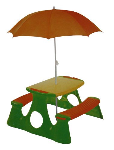 PRODUCT DESCRIPTIONS:Children will have hours fun with this Paradiso Picnic table and umbrella. Encouraging social and outdoor play, this table features two sides of integrated benches and is designed for up to four children to use at once. The children will be entertained with there very own garden table to share with their friends. This Paradiso Picnic table is made from high quality green and orange plastic with a central hole for the umbrella to sit through. The table has rounded edges for added safety, only uses a small footprint and is easy to assemble. Features and Benefits: • Vibrant green and orange colours • Made for up to four children to use at once • Made from high quality plastic with rounded edges for added safety • Easy to assemble • Recommended age: 1-3Years • Product Dimensions: L0.855 x W0.895 x H0.485m • Product Weight: 4.56kg • EAN Code: 5425000337591