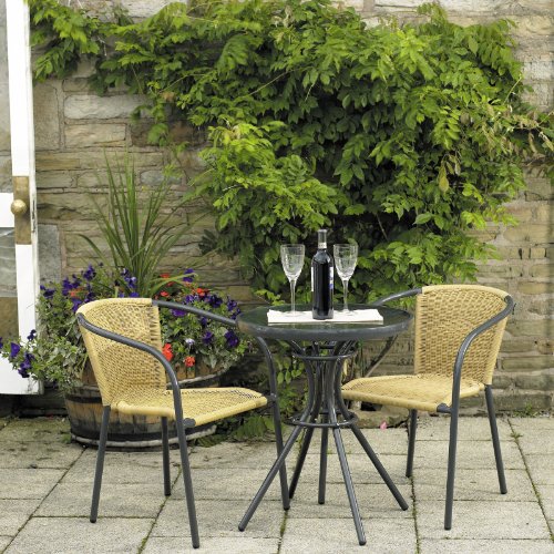 PRODUCT DESCRIPTIONS:• The Paris Bistro set has been designed to follow a traditional style. The lightweight aluminium and woven wicker design provides a fantastic place to sit and enjoy the nice weather as well as perfectly complementing your garden, balcony or patio. • Each chair seat and back has been made from an all-weather wicker which has been woven around an aluminium frame. This wicker means you can occasionally wash it with warm soapy water to keep the set looking great for years. • For added style each table has turn out legs which offer stability and a great look. The top of each table has a safety glass frosted top which gives the set a more modern look. The table provides enough room for a cup of tea while gardening or enjoying the setting sun on a summers evening. • Set includes: One table and Two Chairs • Dimensions: Table: 60cm x 60cm • Chairs arrive ready assembled, Table needs assembly