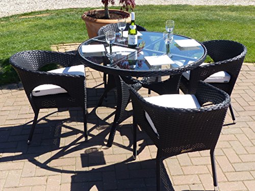 PRODUCT DESCRIPTIONS:1.25M x 1.25M Round Table with 5mm tempered safety glass 4 x Palermo stackable dining chairs 4 Cushions with removable covers, machine washable at 30 degrees Fully fitted weather...