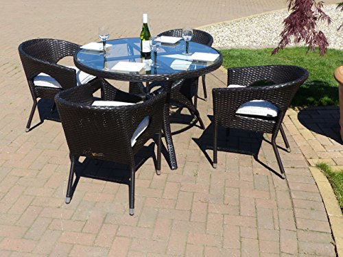 PRODUCT DESCRIPTIONS:1.25M x 1.25M Round Table with 5mm tempered safety glass 4 x Palermo stackable dining chairs 4 Cushions with removable covers, machine washable at 30 degrees Fully fitted weather...