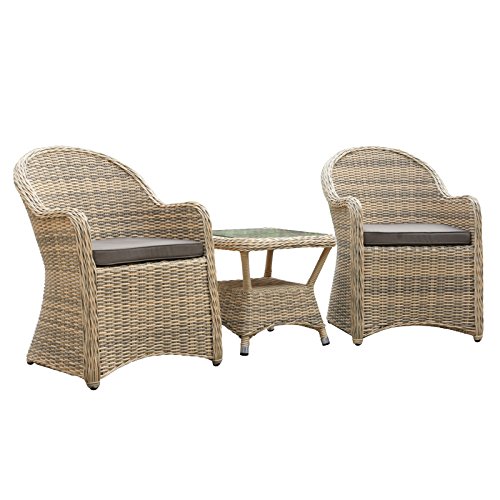 PRODUCT DESCRIPTIONS:Unwind on this twist of a classic design, modern and elegant; the full skirt Sicilia range will liven up any patio or outdoor area, bragging curves and comfort throughout the day. This PE rattan Sicilia tea for two set provides a graceful setting for a sociable gathering: to eat, drink and have fun; whether indoors or al fresco.