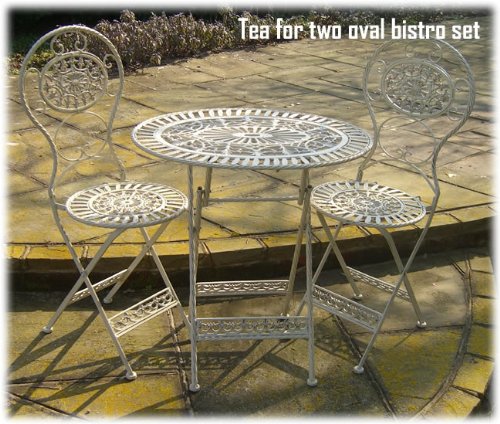 PRODUCT DESCRIPTIONS:This very popular bistro set, finished in antique cream is made from twist steel tube with a ring of press steel leaves welded to a central cast iron middle. Two chair and Oval table