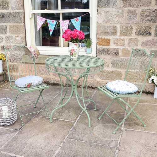 PRODUCT DESCRIPTIONS:A timeless set consisting of a round table and two chairs. Beautifully designed garden furniture made from wrought iron, and finished in a Fresh Vintage Green adding an unusual colour to brighten up patios, balcony or decked areas. A classical bistro set finished in a vintage Green; with attractive arc design chairs which is each intricately moulded into the frame and a slatted table. The two chairs are easy to fold making it easy to store away along with the legs off of the table which can be removed. The comfortable chairs have a slight dip to the edges making it very comfortable to relax and enjoy a meal al fresco. Attractive three piece garden set would be the perfect addition to the sun trap in your garden. Making a beautiful wedding, house warming or birthday gift. Also Available in Summer Blue. Simple Self Assembly required.
