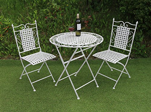 PRODUCT DESCRIPTIONS:White Lattice Woven Metal Patio Table & 2 Folding Chairs This is a well designed good looking metal set with a white mottle and slightly highlighted aged effect. Chairs and table fold for easy storage when not in use. The well proportioned chairs complement the table making this an attractive addition to any garden especially a traditional English garden. Suitable for indoor and outdoor use, superbly designed and ideal for conservatories or patios. Approximate Size: Table: Height:75cm Diameter:70cm Chair: Height:91cm Width:45cm Seat Height 38cm Colour may vary slightly due to lighting conditions when photographed. PLEASE NOTE: WE DO NOT DELIVER TO - Scottish Highlands/Northern Ireland/Channel Islands & Outlying Area Addresses See Detailed Seller Information