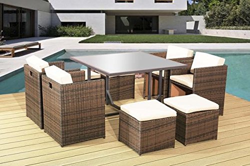 PRODUCT DESCRIPTIONS:MAINLAND UK ONLY Set contains 4 chairs, 4 footstools and 1 table with safety tempered clear glass top. This is perfect dining set for a big family or a group of friends. It's ideal for the summer garden, patio or conservatory. The pvc rattan is hand woven over a rust resistant frame. The durability of this set is brilliant, and it is weatherproof, making it the perfect choice you need to make for the warm months. Comes to you fully assembled and packed in 1 cardboard box. Any dust or dirt can be easily washed off with a hose pipe or power washer. It is also UV light resistant to ensure that the coloured rattan does not fade in the sunlight. The cushion covers can be removed and hand washed if required. Please find detailed dimensions below: Dimensions in cm: Footstool W47 x D47 x H36 Chair W55 x D55 x H68 Table W115 x D115 x H74 Strenghts of our furnitures: style and quality at superb price versatile and adaptable for any kind of garden neat compact design weatherproof and UV light resistant