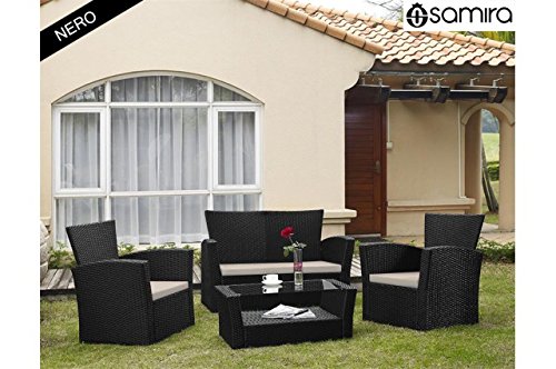 PRODUCT DESCRIPTIONS:Polyrattan furniture outdoor set 4-piece: Loveseat, 2 armchairs, 1 table with double floor, tempered glass (thickness 5 mm). Components are made with steel framework covered in synthetic rattan weaved together, perfect material to be placed outdoor. Highly resistant to UV rays, water and weathering. For comfortable sitting, pillows made in polyestere, fabric normally used for outdoor garden upholstery, are provided together. Aurora set is knurled in black colour with grey pillows. Inside packadge, you can find instruction manual for easy assembly steps.