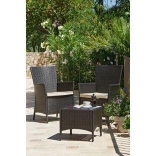 PRODUCT DESCRIPTIONS:This incredibly stylish Bali 2 Seater Bistro Set will be a highly sophisticated addition to your garden. The garden table has a bohemian rattan effect and sleek glass table top, lending a modern touch, while the 2 plush chairs feature cream cushions for supreme comfort. Maintenance: Clean your outdoor furniture regularly with a mild, soapy water before drying it thoroughly with a clean, dry cloth. If storing your furniture indoors isn't an option, invest in a good quality cover for protection against the elements. Regular maintenance and care will make your outdoor furniture last longer. Garden table features: Glass table top. Steel garden table. Table size: H40, W45, L45cm. Garden chair features: Steel armchairs . Size H89, W63, D61.5cm.
