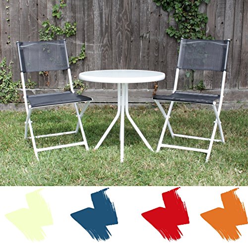 PRODUCT DESCRIPTIONS:Bring style and substance to your outdoor space with this Charles Jacobs Bistro table & chairs set. Made from powder coated steel this set has been crafted to withstand weather and is built to last. The table features foldable legs for easy storage and the chairs have gently rounded seperate free standing back support giving them a distinctive mdoern feel. Ideal for use on a patio, balcony, or just about any outdoor space, Charles Jacobs do recommend that in winter this set is stored inside where possible. This table set is also available in a multiple of colours, this enables you to match your colour scheme perfectly outside to your exacting standards. why not have a look at our online store and see for yourself the quality items we have to offer?