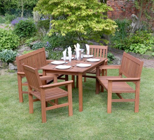 PRODUCT DESCRIPTIONS:Hardwood garden furniture set. Includes two 2 seater benches, 2 armchairs and rectangular table (Length - 140cm x Width - 80cm). Weather treated and all brass fittings. Self assembly required.
