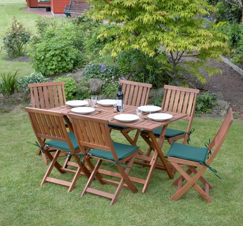 PRODUCT DESCRIPTIONS:A seven piece garden furniture set.Enjoy your garden with this fantastic value garden table and chairs set.The Concord garden furniture set includes a folding rectangular table, six folding chairs and seat cushions.The set is made of hardwood and comes complete with brass fittings.It arrives weather treated and we recommend further treatment at least once a year.