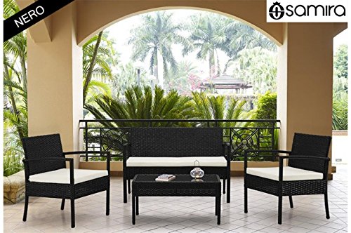 PRODUCT DESCRIPTIONS:Polyrattan outdoor furniture set 4-pieces: Loveseat, 2 armchairs, 1 table with tempered glass (thickness 5 mm). Components are made with steel framework covered in synthetic rattan weaved together, perfect material to be placed outdoor. Highly resistant to UV rays, water and weathering. For comfortable sitting, pillows made in polyestere, fabric normally used for outdoor garden upholstery, are provided together. Martino set is black with beige pillows. Inside packadge, you can find instruction manual for easy assembly steps.